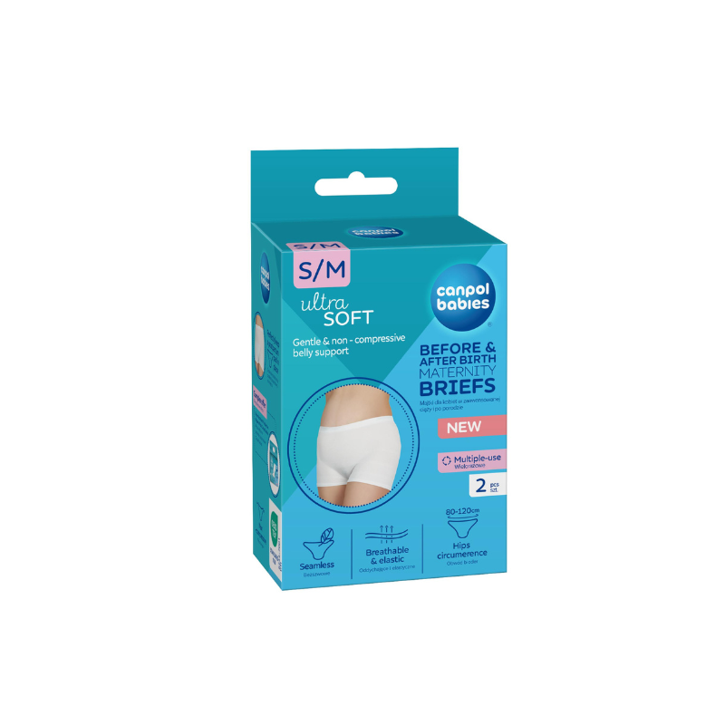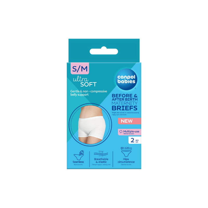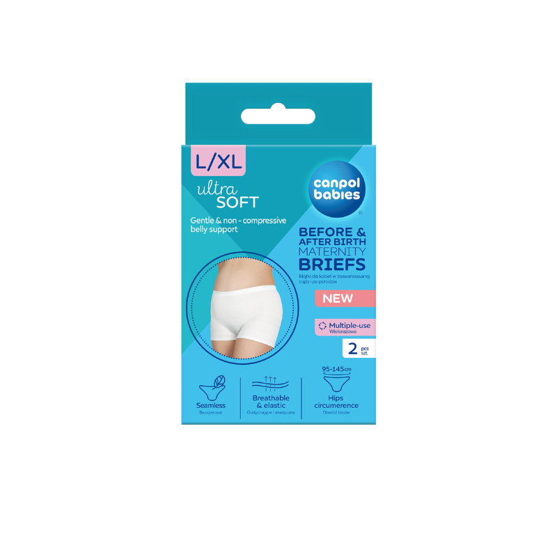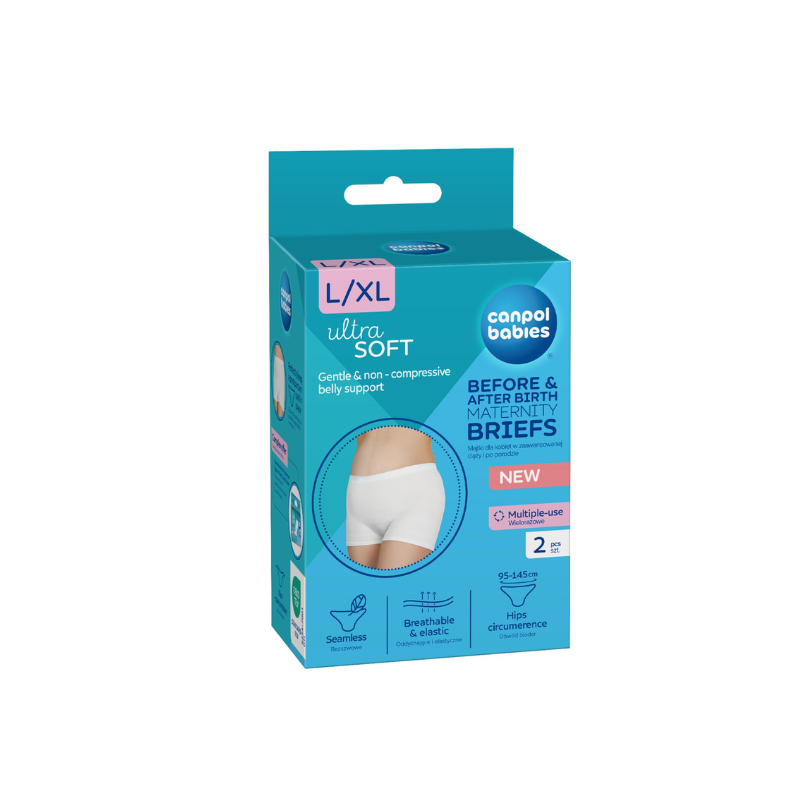 Soft, flexible and very stretchy – they fit perfectly to the belly, do not squeeze, so they are perfect for future mothers throughout pregnancy and after childbirth. They support the abdomen without discomfort or rubbing. They do not irritate the skin and ensure free air flow. Discreet, invisible under clothes, they provide comfort all day long. Canpol babies maternity briefs perfectly hold the postpartum pad in place, ensuring comfort of use. Appropriate postpartum underwear facilitates and accelerates the healing of wounds, both after physiological delivery and after Caesarean section. The high waist of the panties is gentle on the cesarean section scar. Canpol babies briefs for pregnant women are reusable and can be washed. The package contains 2 pieces.