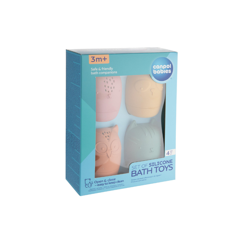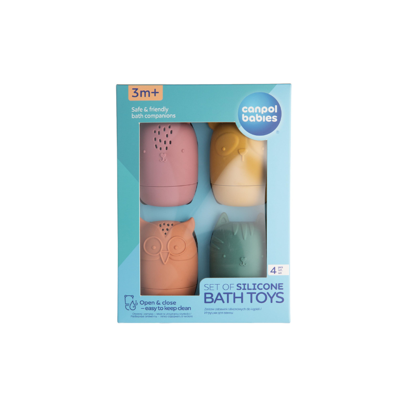The set of 4 cute bath toys in a variety of colors and textures will make every bath time more enjoyable. Open structure of the toys allows for thorough washing and drying of the them inside, preventing the accumulation of dirt and the formation of mold. It is a convenient and very hygienic solution, created with the health and safety of children in mind. The bath toy set arouses the child’s interest and teaches creative thinking thanks to the many possibilities of play. The toys can be opened and the upper and lower parts can be combined freely, thanks to which they develop the child’s imagination and creativity. Filled with water, they spray water when pressed – they practice accuracy and make a lot of fun. Canpol babies bath toys are 2-in-1 made of soft BPA-free silicone, they can be used as teethers for children. Canpol babies bath toys are shaped to fit children’s hands, enabling the child to easily grasp and play safely, supporting its development.