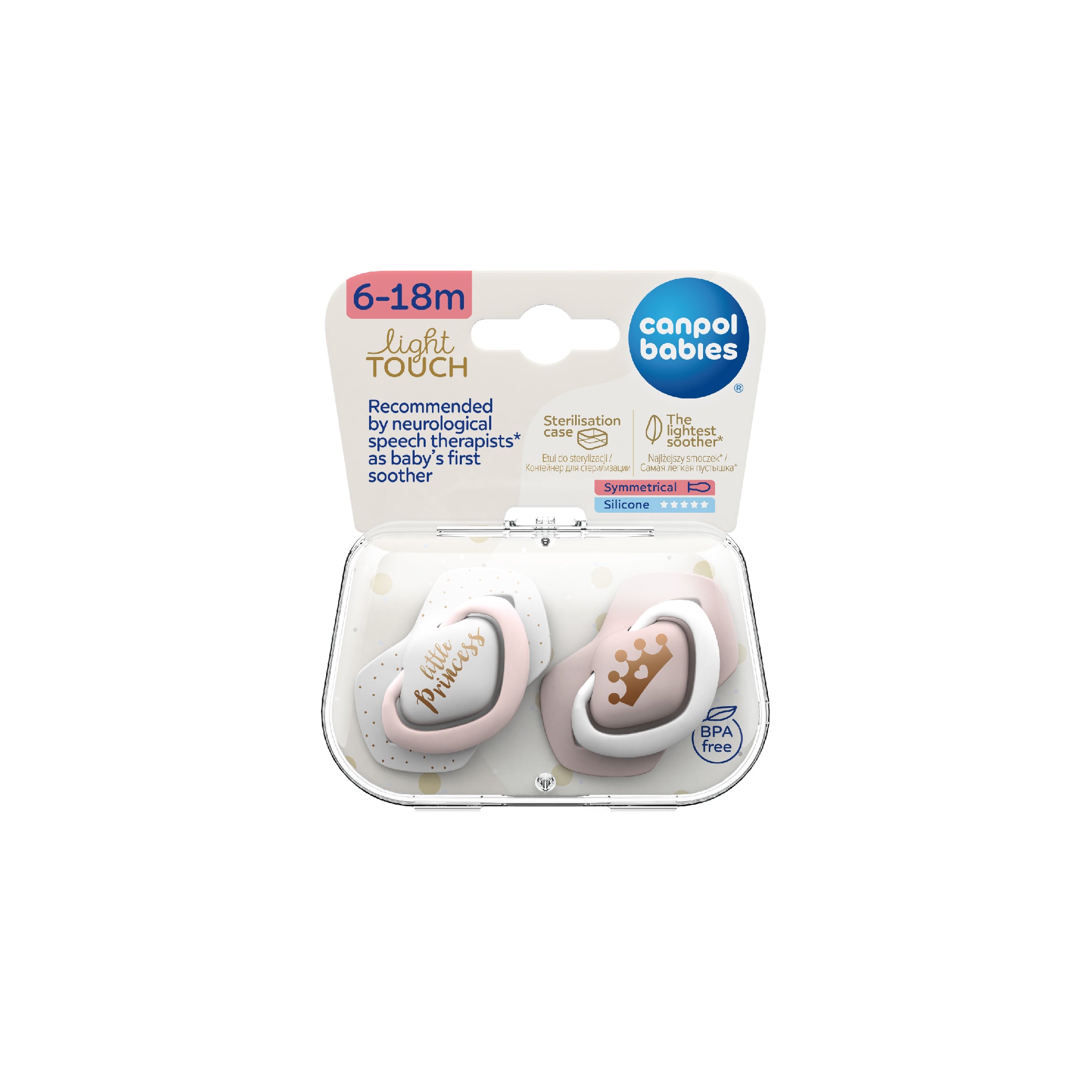 Recommended by specialists as the first soother for your baby. Light touch soothers have been created to ensure maximum comfort for the youngest children. Their exceptionally soft silicone rubber requires less effort when sucking, and the light, profiled shield does not burden the occlusion and enables free breathing which, according to specialists, exerts significant impact on the development of oral cavity. The comfortable handle allows for attaching a shooter holder and makes it easier to give it to your child. Light touch soother are easy to keep clean thanks to the modern case which can be used for storage as well as for quick and convenient disinfection in the microwave. A little water and two minutes are all it takes to ensure that the soothers are hygienically clean. Light touch soothers are available in several unique, trend-inspired collections and different sizes – they grow with your little one.
