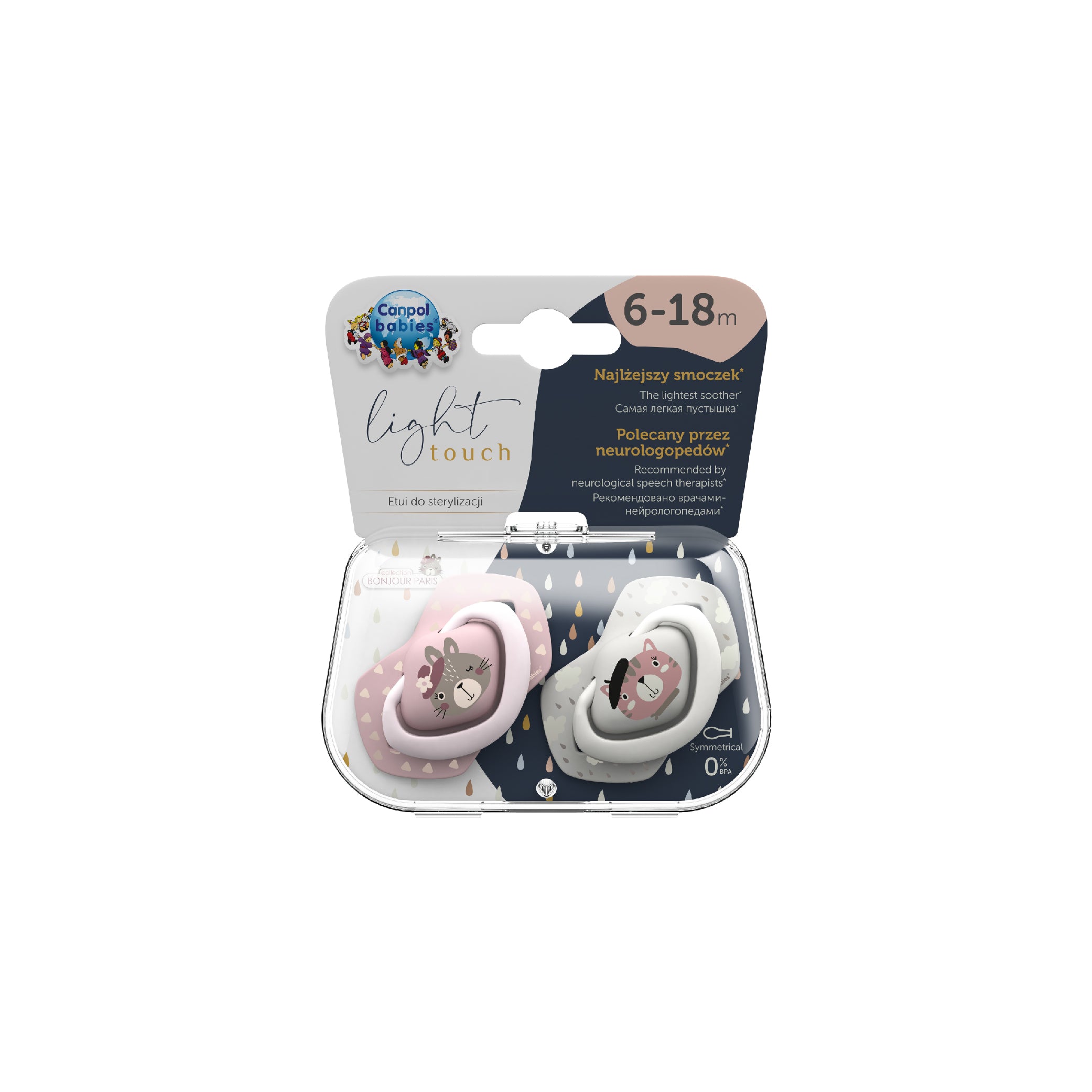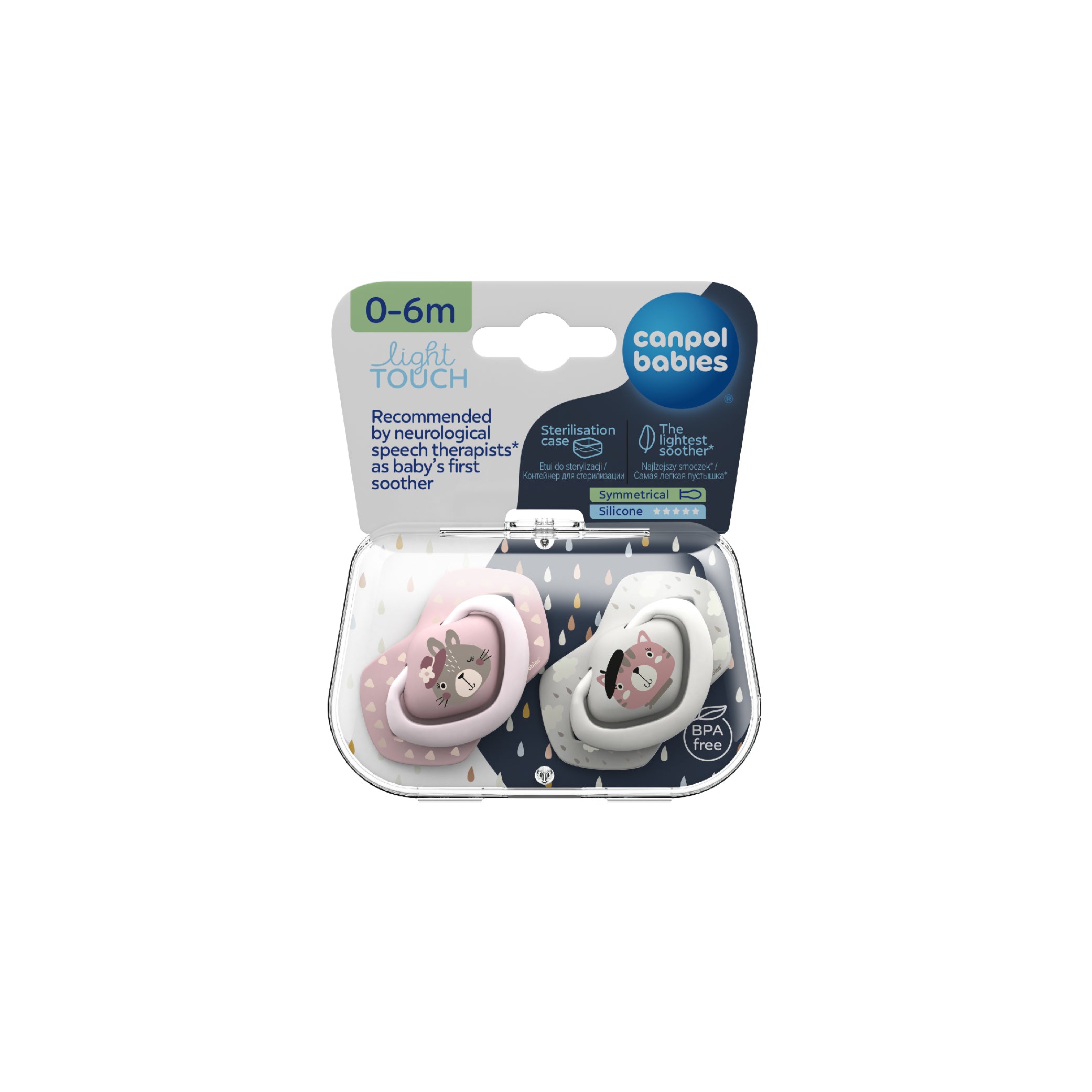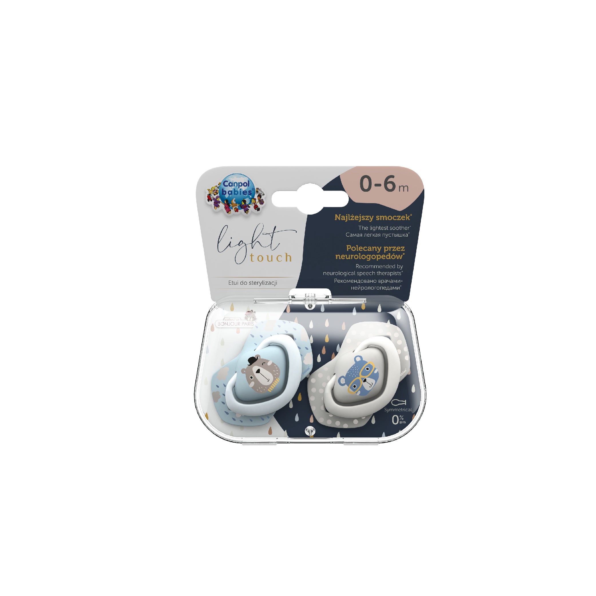 Recommended by specialists as the first soother for your baby. Light touch soothers have been created to ensure maximum comfort for the youngest children. Their exceptionally soft silicone rubber requires less effort when sucking, and the light, profiled shield does not burden the occlusion and enables free breathing which, according to specialists, exerts significant impact on the development of oral cavity. The comfortable handle allows for attaching a shooter holder and makes it easier to give it to your child. Light touch soother are easy to keep clean thanks to the modern case which can be used for storage as well as for quick and convenient disinfection in the microwave. A little water and two minutes are all it takes to ensure that the soothers are hygienically clean. Light touch soothers are available in several unique, trend-inspired collections and different sizes – they grow with your little one. Suitable for babies from 0-6 & 6-18months.